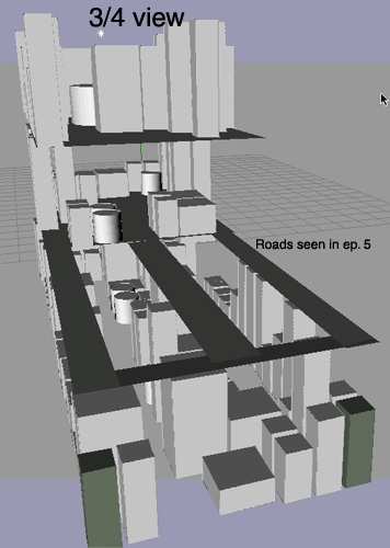 Here is a 3/4 view showing a possible layout that is not in too much conflict with the show. Notice again the roads on the second tier match up with the roads in Episode 5.