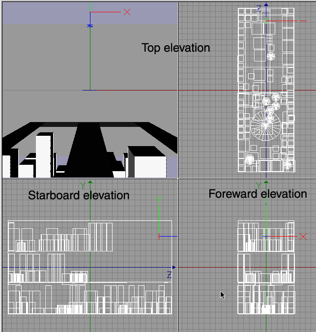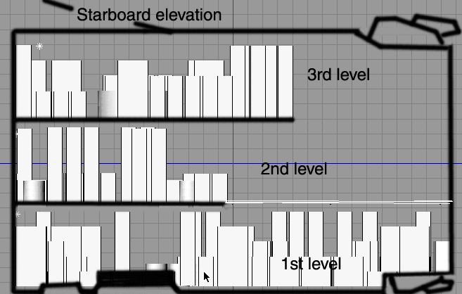 This first illustration is a cutaway of the mid-section of the ship and ONLY the midsection of the ship, the most likely place for the city to be located in my mind. I have drawn in the large cannon so you could get a clear indication as to the section of the ship I'm talking about. Each sqaure represents 10m to a side (or 100m squared). That means the tallest buildings are 50m tall or about 12 to 15 stories. I picture most of these being apartment style buildings with many, many rooms.