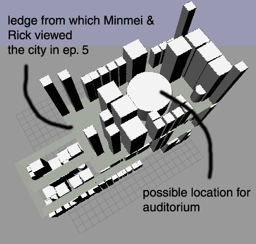 Here's some more nit-picky stuff... The ledge I spoke of above (in a park like area that separates in two leaving Minmei to stare down at the massive city below) and a possible location for the large auditorium.