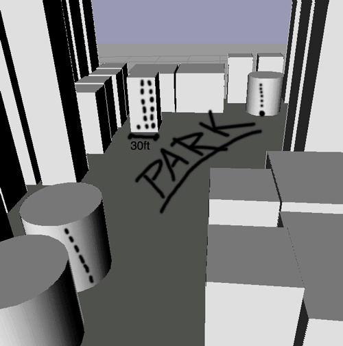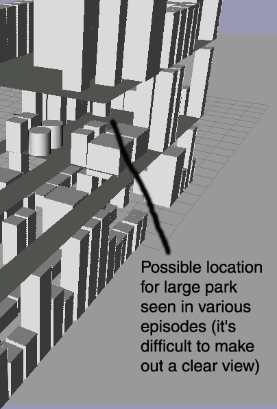 Here we go, I was able to zoom in... The possible location of the park and some quick paintbrushing to show the approximate size of the buildings, around 6 stories for the short ones.